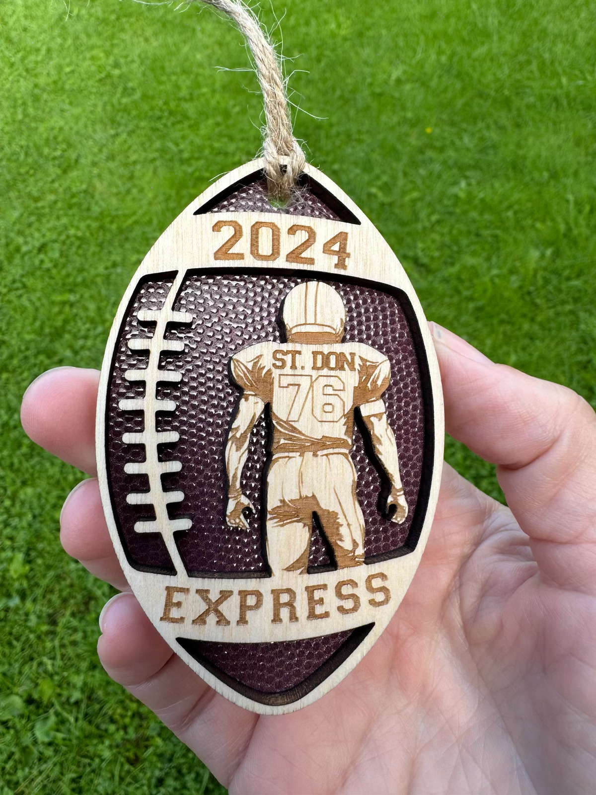 Kick off your holiday season with our Football Ornament! This unique 2 layer ornament features a textured design and can be personalized to make it even more special. Perfect for any football fan, it's a touchdown gift for the holidays.